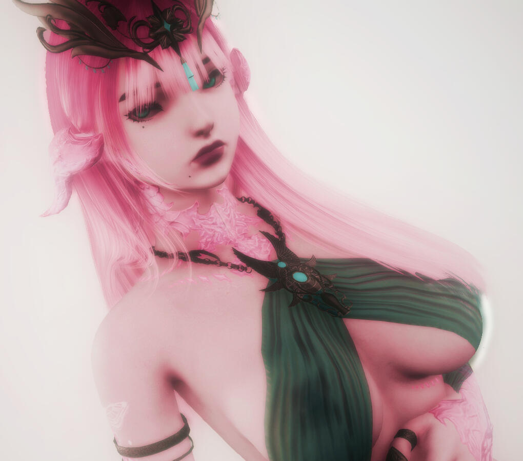 She is a petite little thing, lithe and easy to tower over. Her stature is far from intimidating, but despite this, she dances fiercely on stage and in those moments, she shines. Her complexion is that of fine porcelain, a sea of alabaster that is highlighted by feminine, pink scales. The same shade graces her horns, tail, and the long tresses that billow over her shoulders. Her eyes are captivating, with a hue that seems to struggle between ocean green and early morning sky blue. Her lips offer a perfect cupid's bow with a slight pout to the bottom, as if they were always offering a little kiss.Her body is home to sleek, taut muscle that is focused especially on the thighs. Her midsection is trim while her hips and bust favor more womanly measurements, enticing the eyes with their perky yet ample curves.